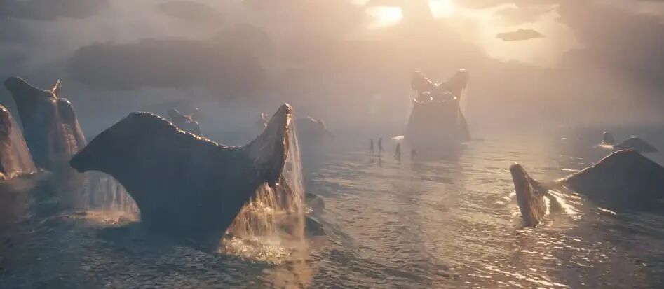 此外,从第一部开始,卡梅隆就在有意进行叙事的环境化呈现。这一点在《阿凡达:水之道》中尤为明显:在3个多小时的片长内,卡梅隆留出了1个小时来为观众呈现了一段关于潘多拉星球的海洋纪录影像。而在本作中,影片第一次具象化表现潘多拉星球的星魂“爱娃”,以及潘多拉生命的精神世界,这使得观众的关注点从个体家庭命运迁移至潘多拉作为一个生命共同体的生态构建之上。