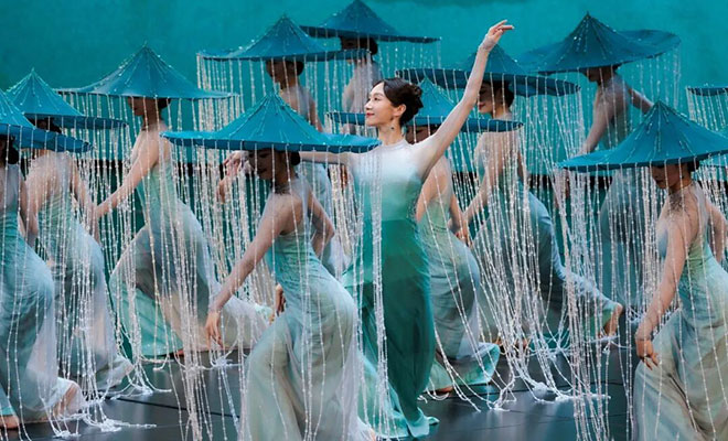 舞蹈《喜雨》则与东方美学深度融合,使高雅艺术拥有了触手可及的亲和力。领舞孟庆旸身姿轻盈如燕,率浙江音乐学院诸位学子在烟雨氤氲的舞台上勾勒出江南春雨的意趣。学子们所穿的渐变青绿色舞裙与升降屏所创造的纵深意境彼此呼应,肢体舒展处皆见妙趣:指尖轻颤若雨点落荷,细腻传神;足步流转似小舟凌波,清闲自在。随着舞段的推进,舞台色调从青绿自然过渡到金黄,演员的动作也从轻柔的“润雨”自然转至舒展的“迎春”,春雨孕育丰收美好的寓意被自如地注入每个细节,艺术表现与时代精神真正同频共振,浑然契合。