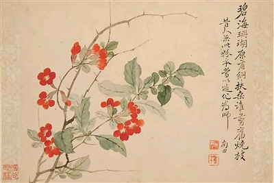 天津博物馆藏《瓯香馆写生图册》则道尽了没骨花卉艺术的精彩。十开册页写四时花木,从春桃海棠到夏日繁华,再到秋菊、冬梅,季节递换,气息始终生动。全册不设重景,大面积留白托出花枝的姿态,空间因虚而更阔;花叶不以墨线勾廓,凭色层层叠染成形,风格清新古雅。