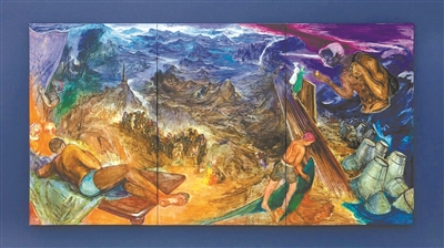 《沉潜之梦》把这种压缩推得更彻底。六联画里挤满了人物、器物和带有仪式意味的场景,中央那个深蓝色巨大形体像是舞狮,多个人体被包裹在其中,彼此托举,向上生成。但这个动作在这里已经不是节庆性的,而是一种沉重的承载:向上的动作和向下的负重同时发生,支撑他人的身体,自己也被压在结构之中。